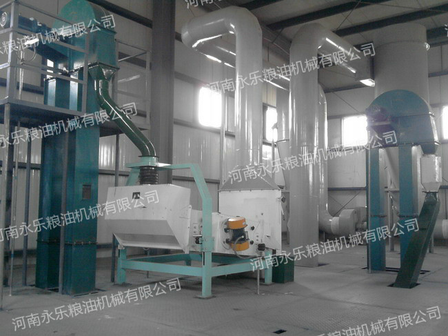 原料→均勻下料器→提升→剝殼→清理→磁選→軋胚→軟化→蒸炒→榨油→毛油過濾→毛油